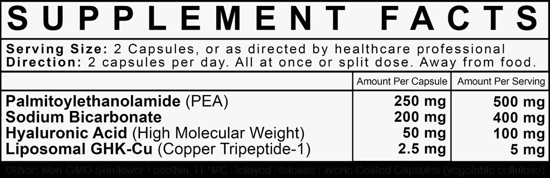 PEA, along with buffering agents like Sodium Bicarbonate and SNAC, work synergistically to mitigate oxidative stress and inflammation, providing broad anti-inflammatory and neuroprotective support.