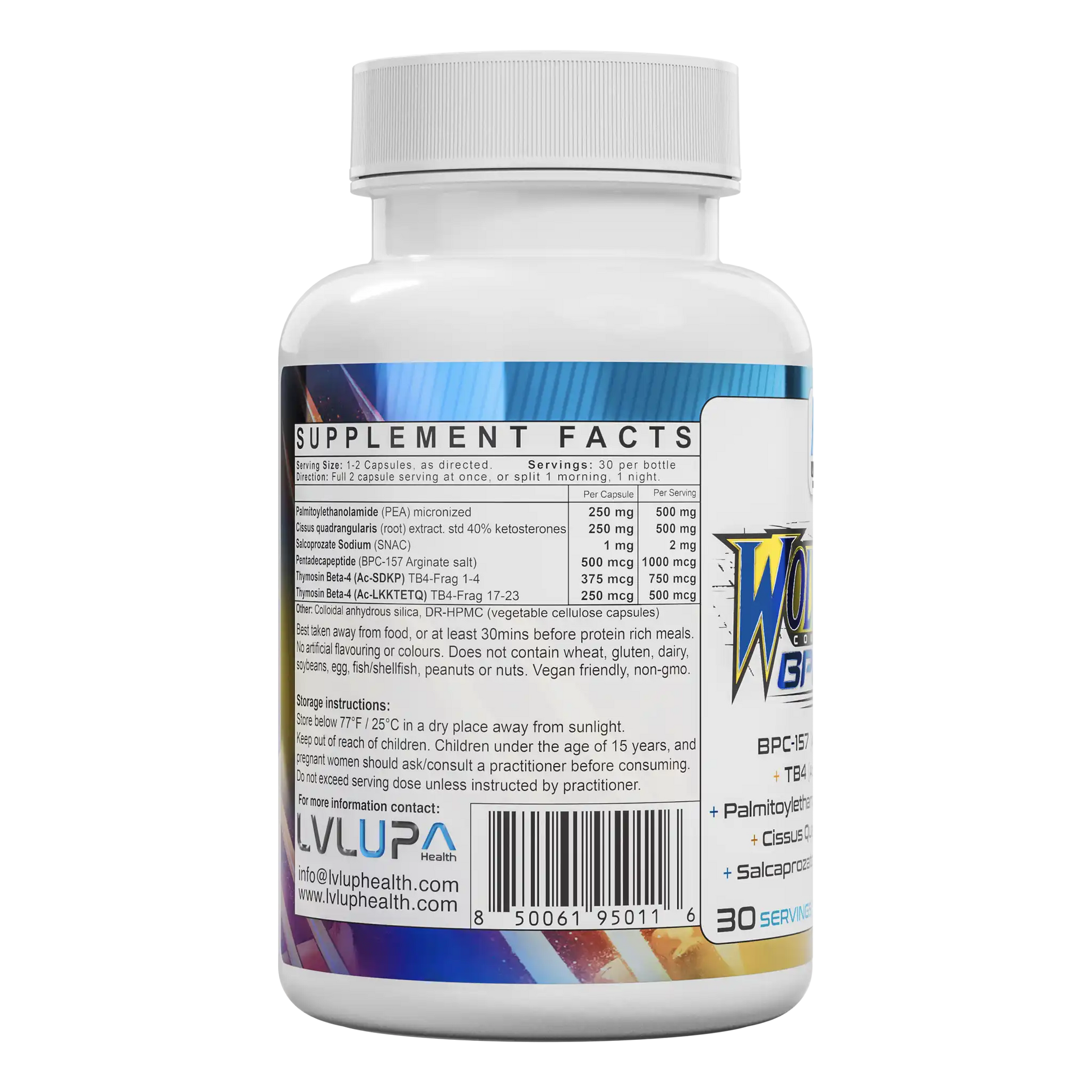 Each capsule contains a synergistic blend of BPC-157 (as Arginine Salt), TB4 Fragments, PEA, SNAC, and Cissus Quadrangularis without unnecessary fillers or artificial colours.